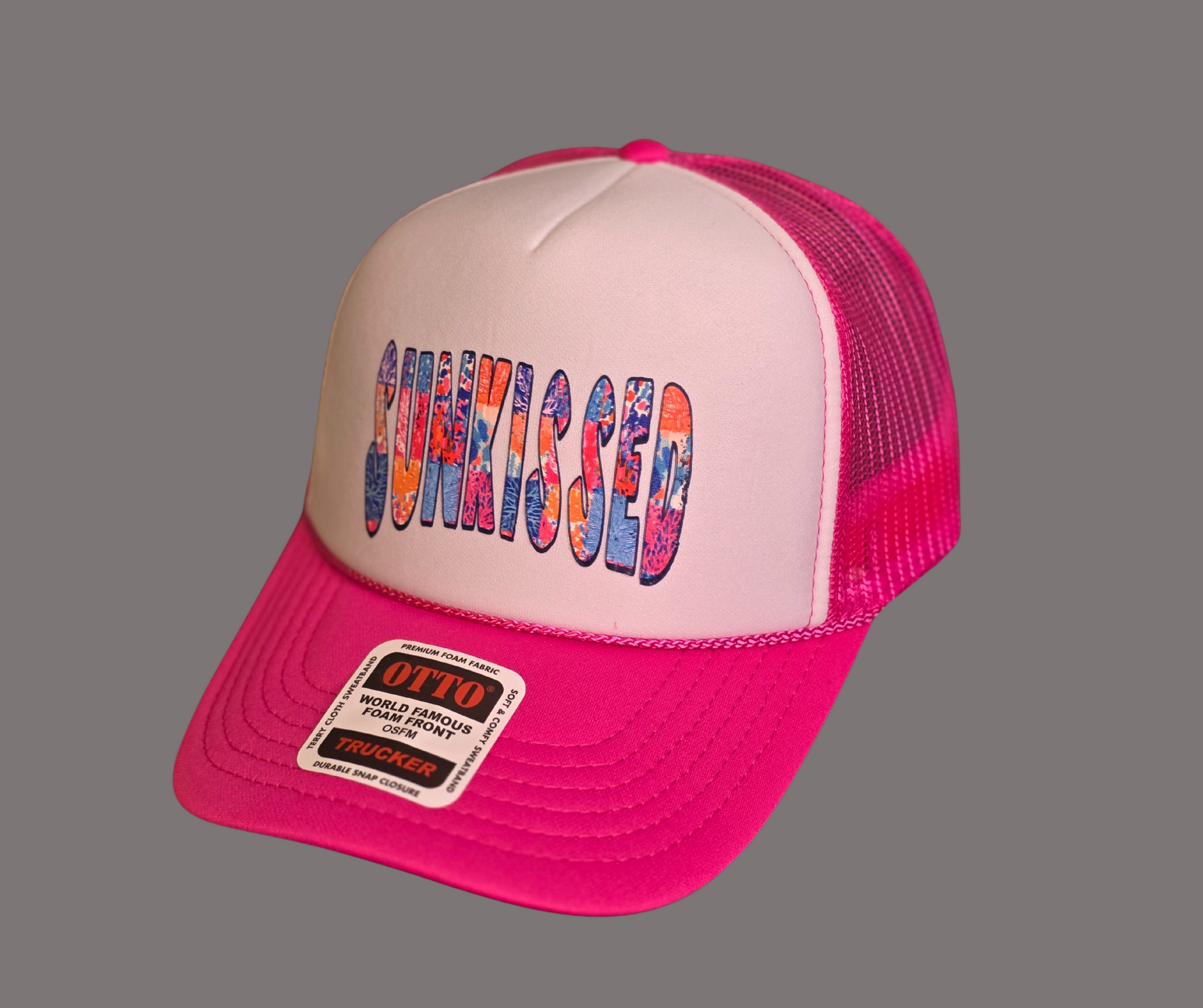 Embrace the sunshine in style with the Sunkissed Trucker Hat, featuring a bold Front panel with vibrant, patterned lettering. This hat combines fashion and function with its soft foam front, breathable mesh back, and durable snap closure, ensuring a comfortable, adjustable fit for all-day wear.
